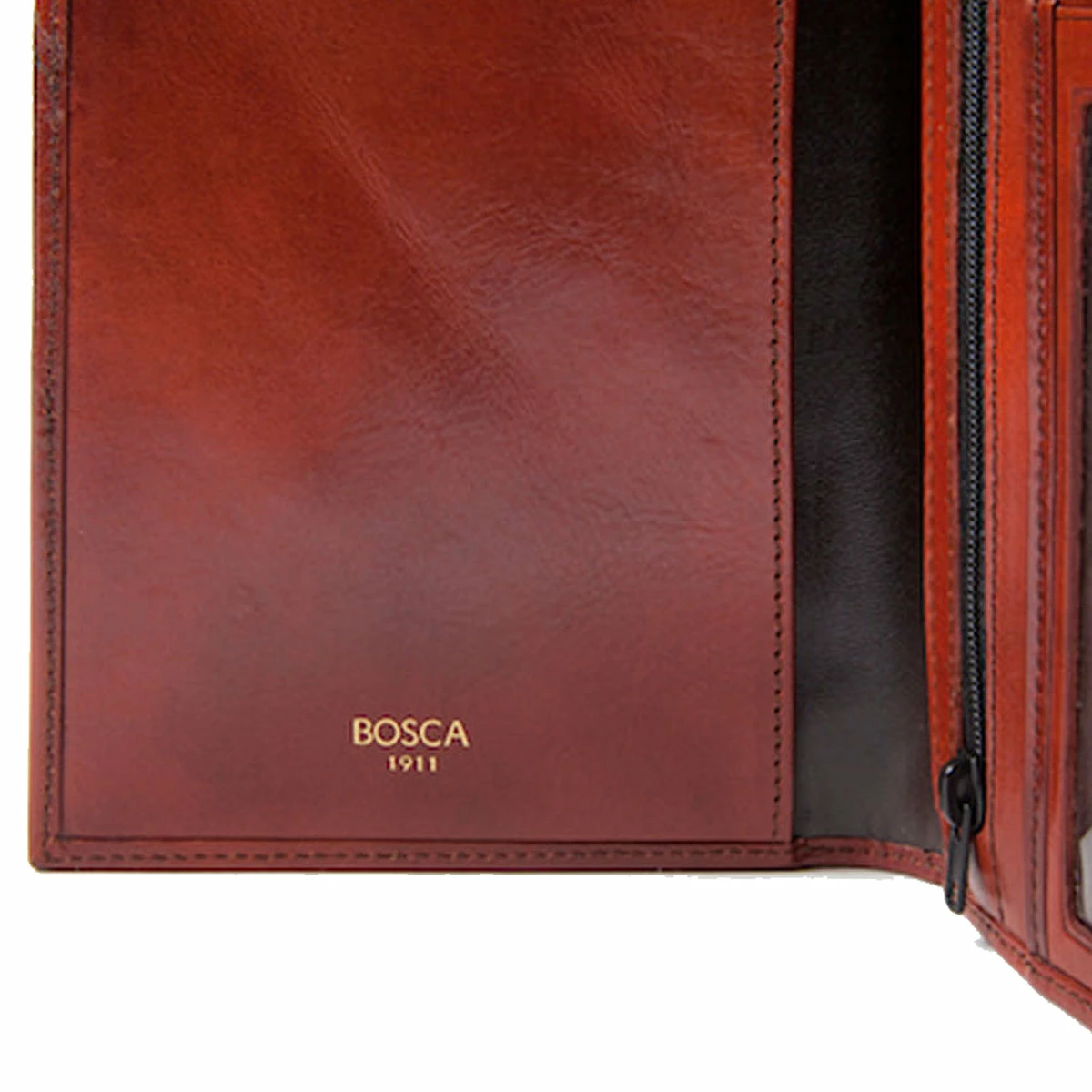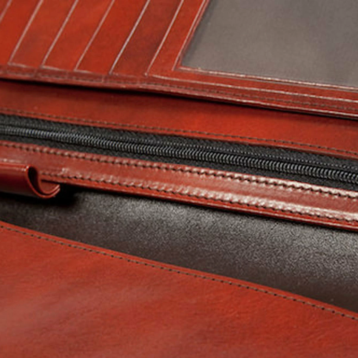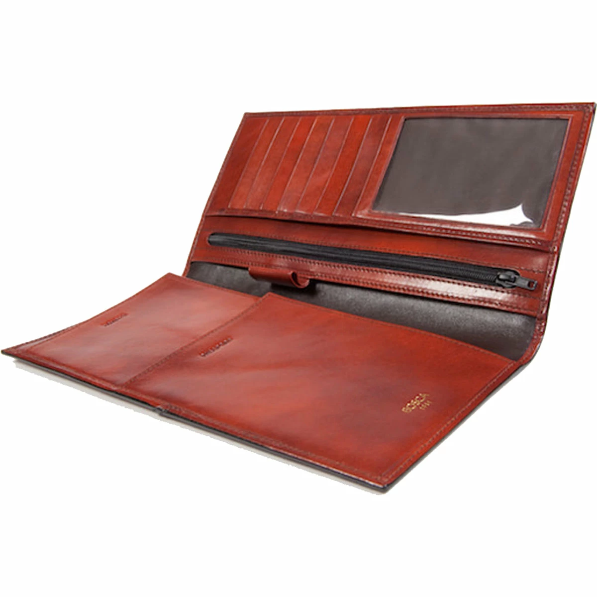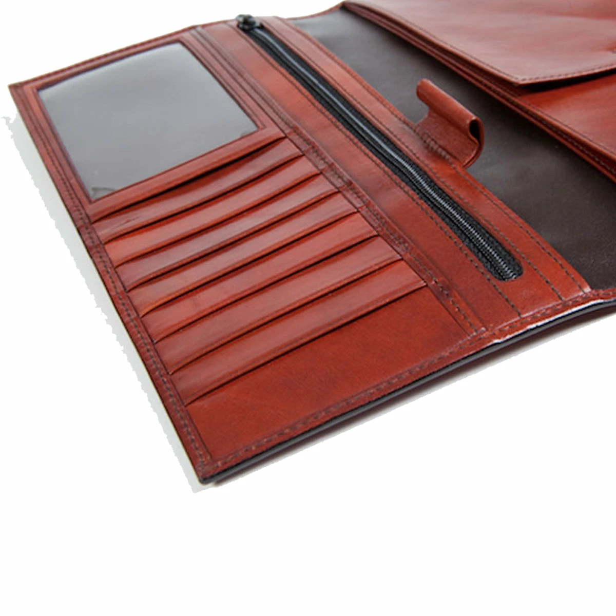 We designed this men’s leather wallet and passport case to hold everything you need when jet-setting around the globe – on the front is placed a ticket pocket for easy access, while inside you’ll find seven card slots and clear ID window for easy display. Two large pockets hold additional tickets, passports and receipts, while a zippered pockets secures cash and other valuables. Adequately spaced to hold everything from passports, boarding passes, multiple currencies and small electronics.