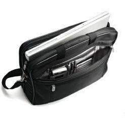 This airplane carry-on size executive rollerbrief, a nylon with faux leather detailing beauty with front zipper pocket, is fitted for the working, traveling woman who appreciates the smart and unconventional, and features a retractable handle, two roller-blade wheels, padded compartments for a 15″ laptop and an electronic tablet/reader, two top zip compartments and much more.
