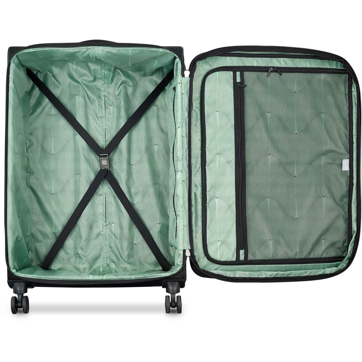 - Elastic tie-down straps and zippered pocket in main compartment. Three-side opening lined divider with mesh pocket in lid.