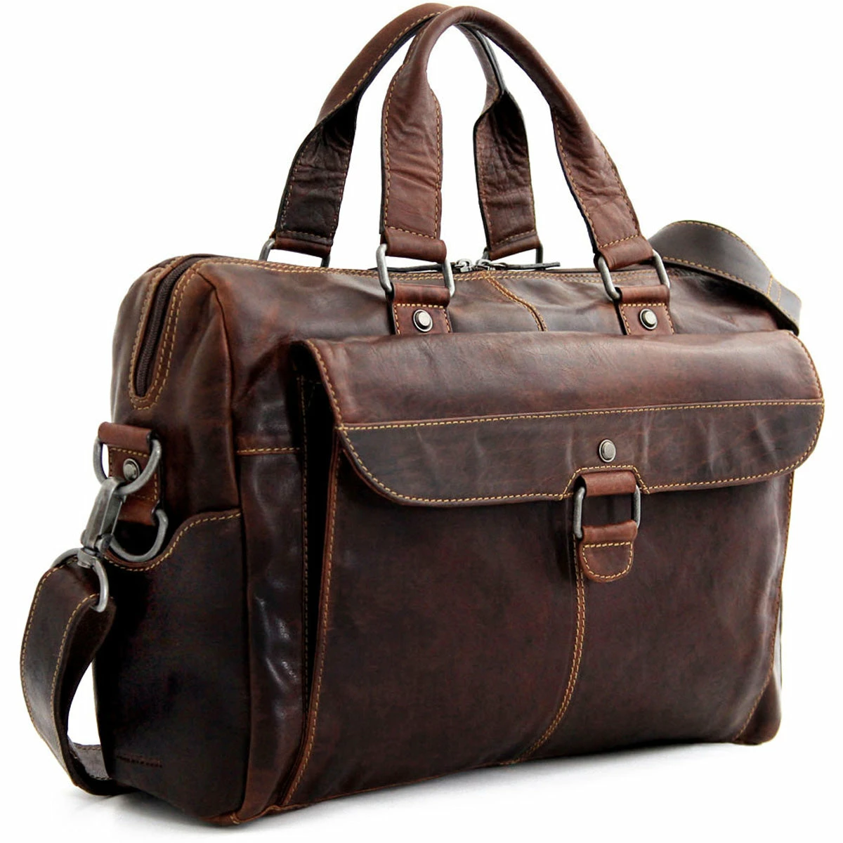 Keep your files and documents neatly organized and your laptop computer well-protected in Jack Georges Voyager Zippered Briefcase With Front Flap Pocket. Its soft, smooth, and supple buffalo leather builds a beautiful, rich patina as it ages. Top zip closure allows items to be secure inside including laptops with up to a 15″ screen. The large front pocket and zippered back pocket are the perfect places to keep items that you need quick, easy access to. A trolley strap on the back comes in handy when you’re traveling as it allows the bag to be attached to a wheeler. Organizer pockets inside will hold your cell phone, wallet, pens, and accessories. A full-length zippered inside pocket will keep your critical documents separated and secured. An adjustable/removable shoulder strap adds carrying comfort and convenience. This handmade leather briefcase features: