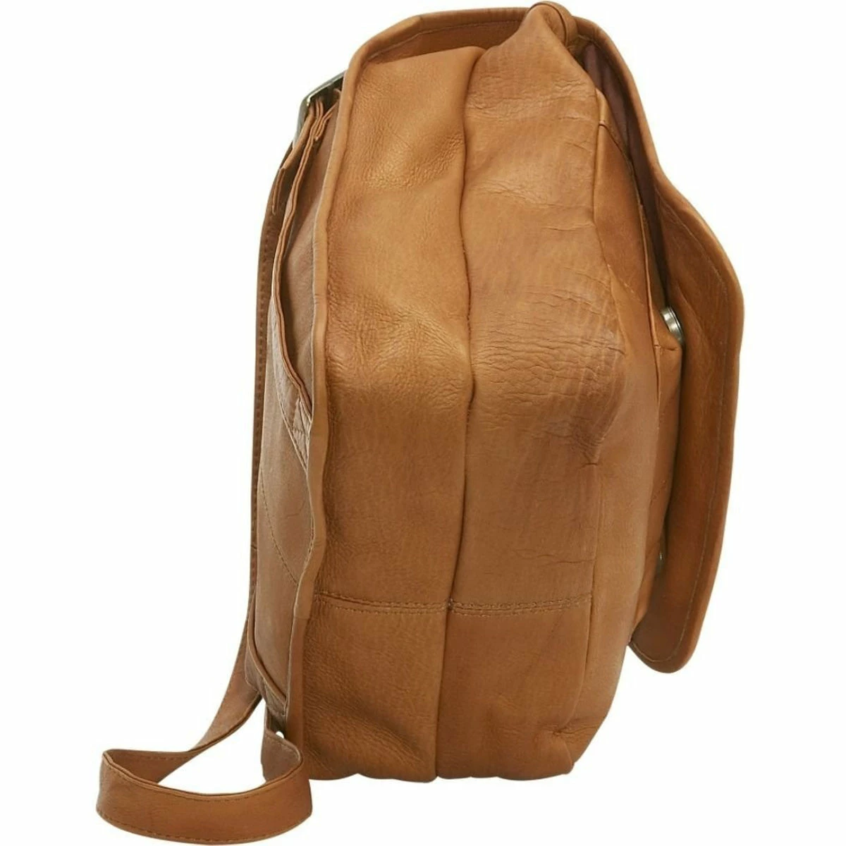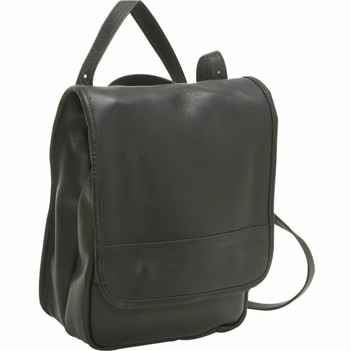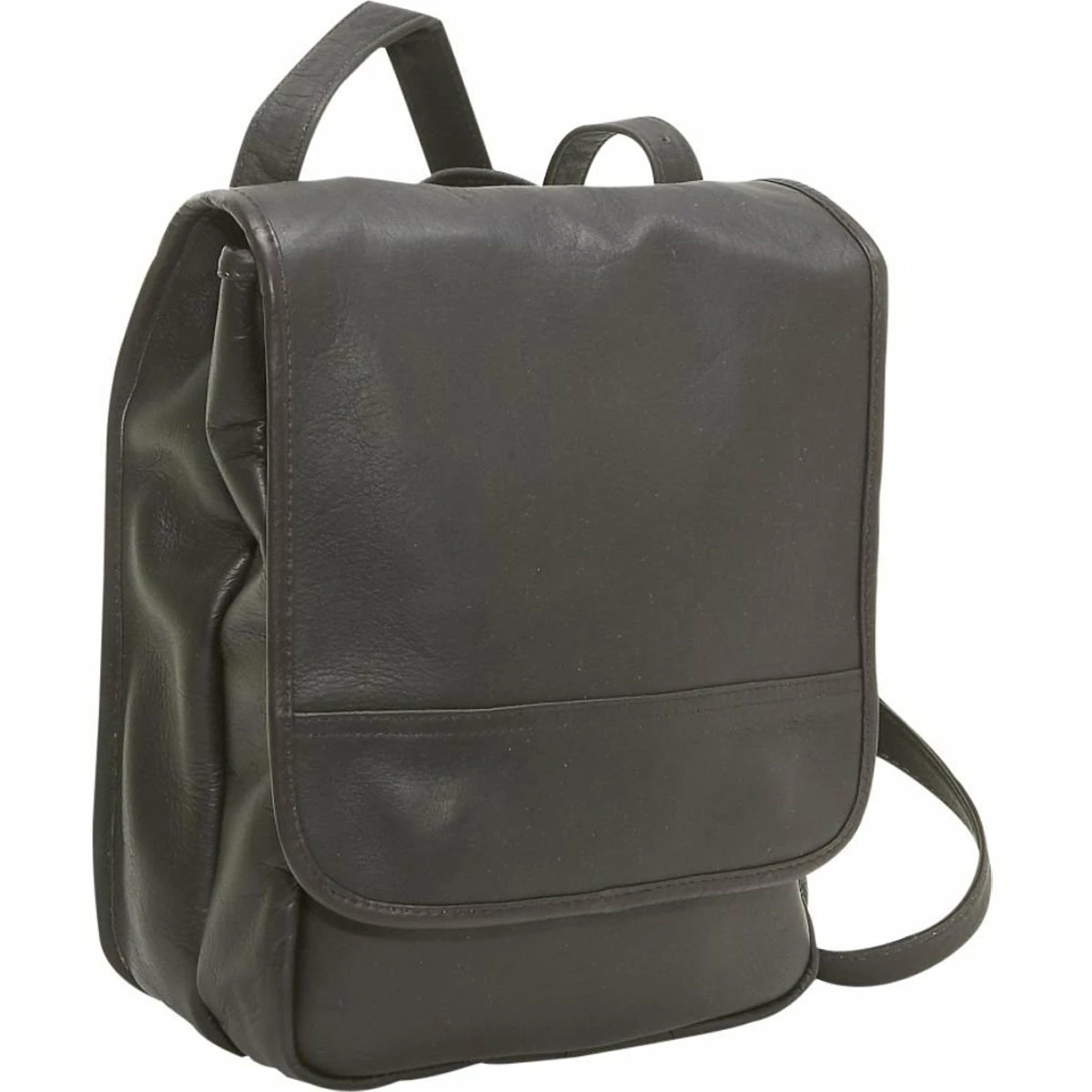 The leather purse backpack’s magnetic-snap-secured front flap has a large, convenient zip pocket. Under the flap, there’s an exterior slip pocket and in front of this, leather organizers for pens, cards and cellphone. The fully lined, spacious interior compartment includes a generous zip pocket. Plus, there’s a full-size slip pocket on the back of the bag.