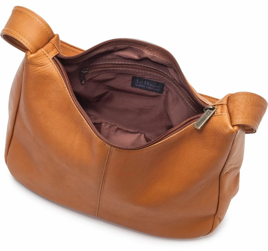 This Ledonne Leather Urban Hobo bag offers the best of both worlds – fashionable, handcrafted South American Vaquetta leather, plus a spacious, zipper-secured main compartment with one interior zipper and one slip pocket. Antique hardware adds an elegant touch to the sturdy shoulder strap, while four colors allow you to easily coordinate with any wardrobe.