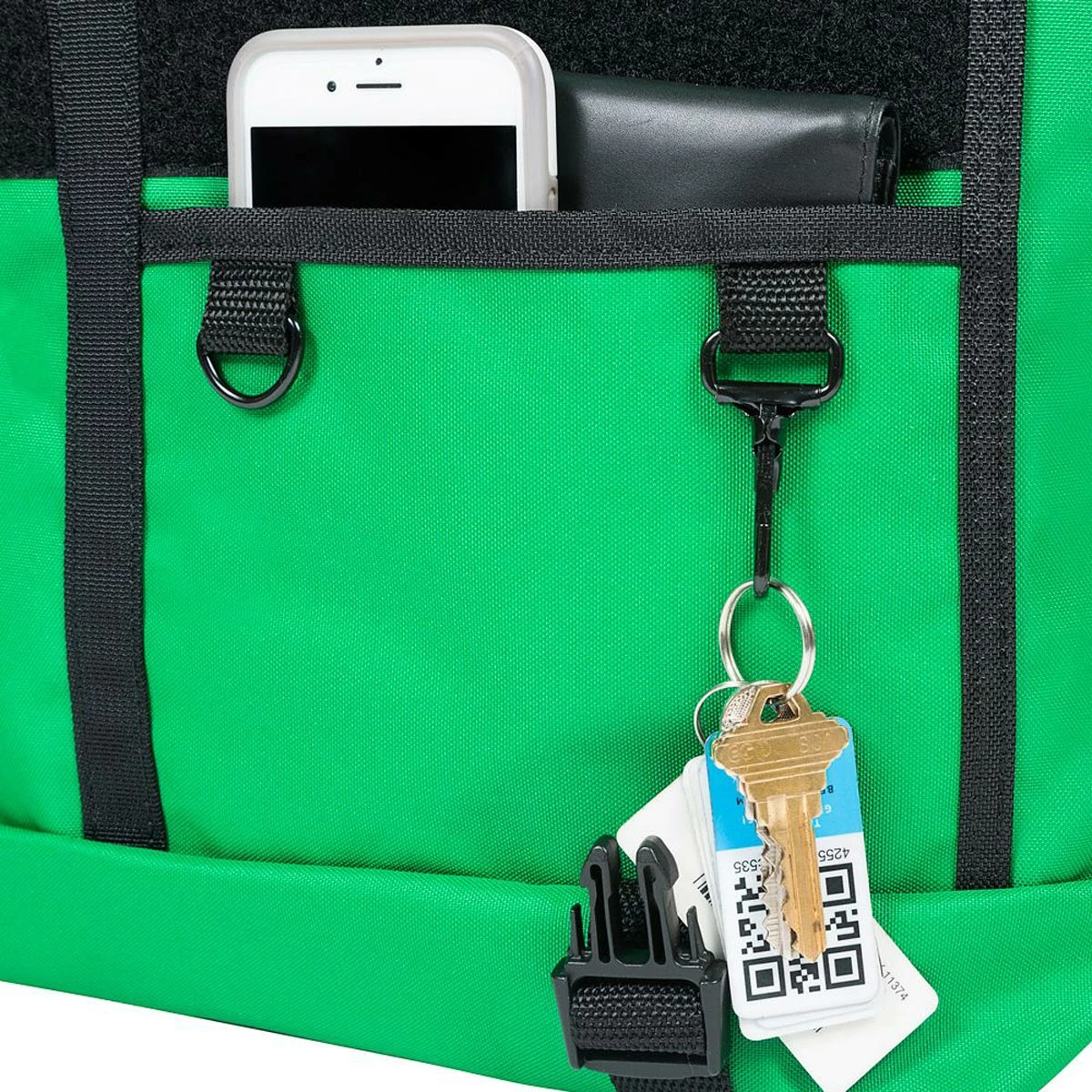 - Two zippered pockets and one open pocket (with attached clip and key ring) underneath the flap