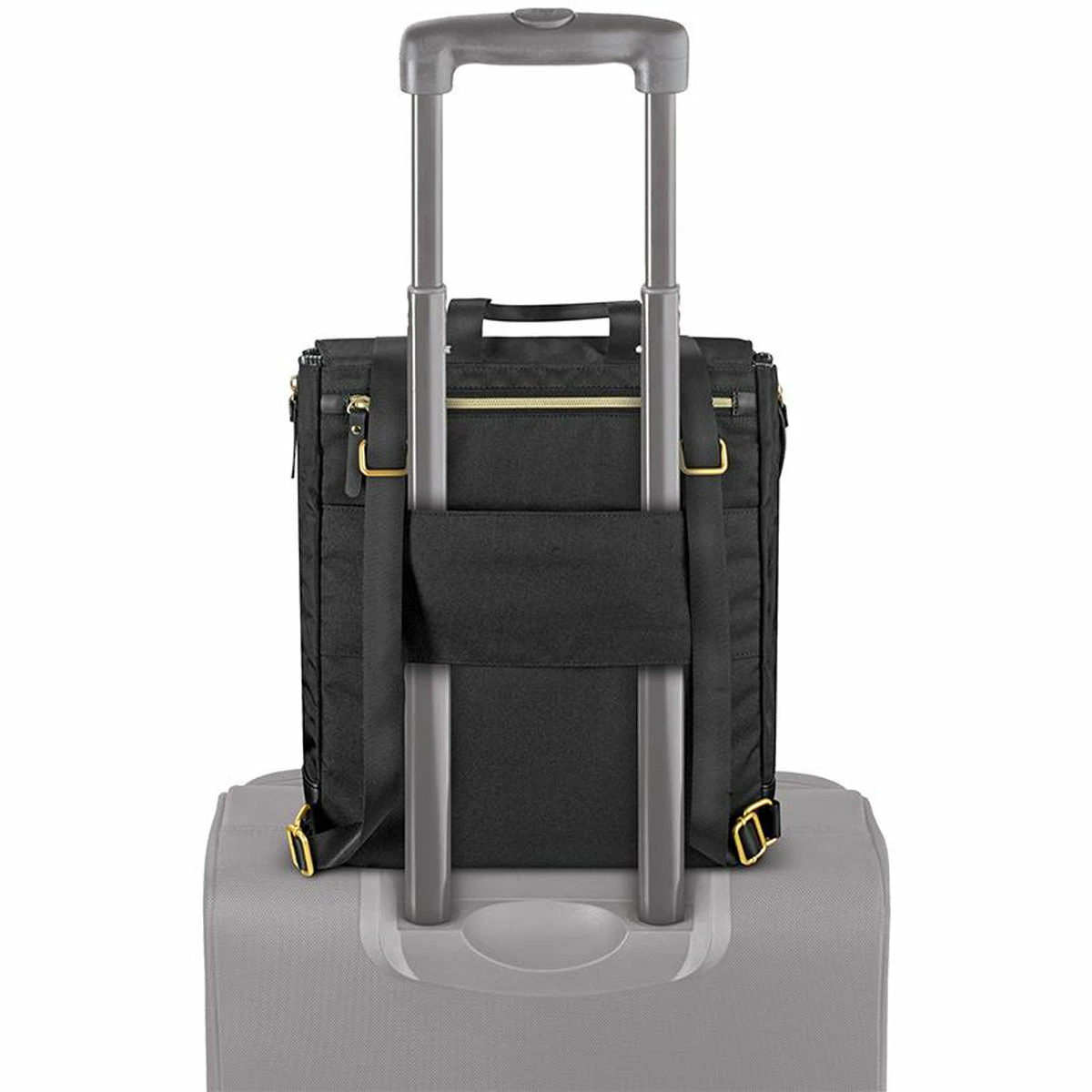 - Back panel slides over luggage handle