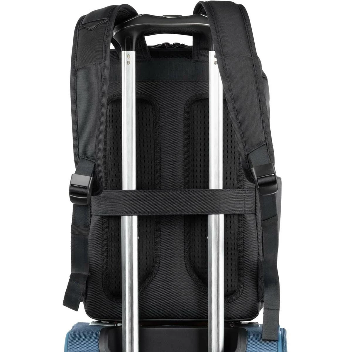 - When it’s time to move, the padded airflow back panel and adjustable, padded shoulder straps provide superior comfort and a dedicated strap pocket for earbud storage. For hands-free mobility, an unobtrusive rear stacking strap fits around the extension handle of any Rollaboard® or spinner suitcase