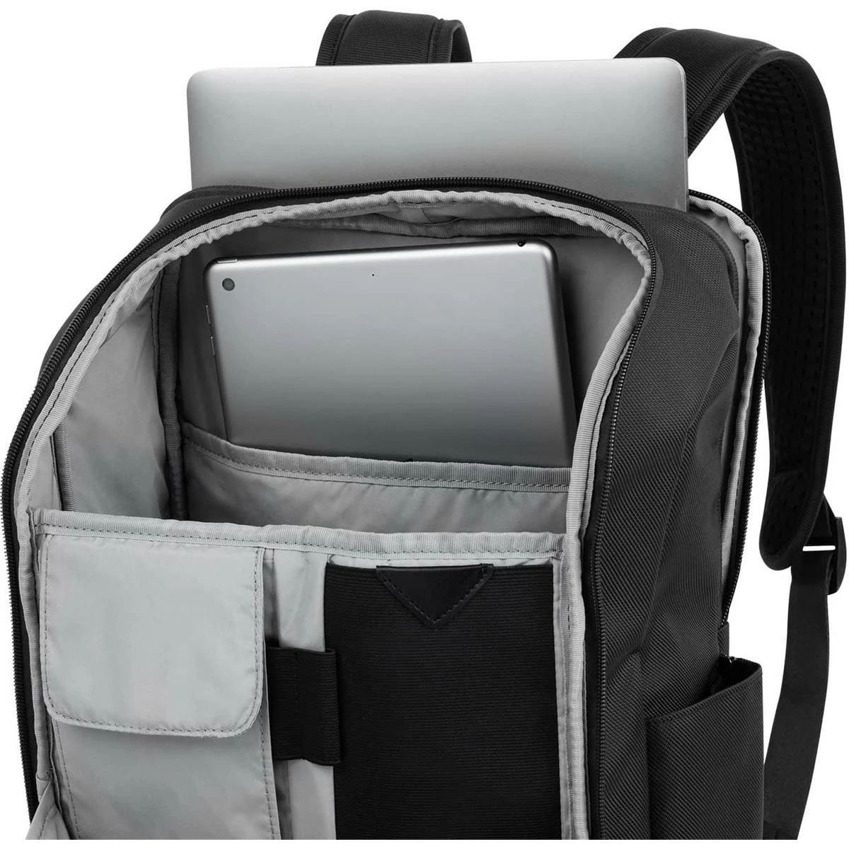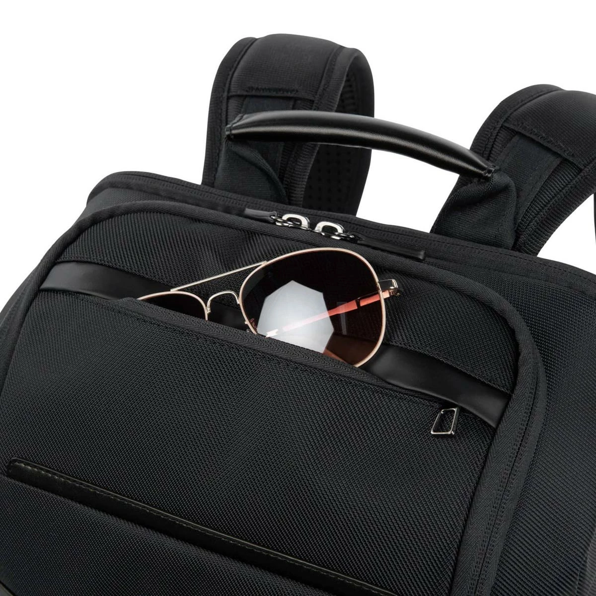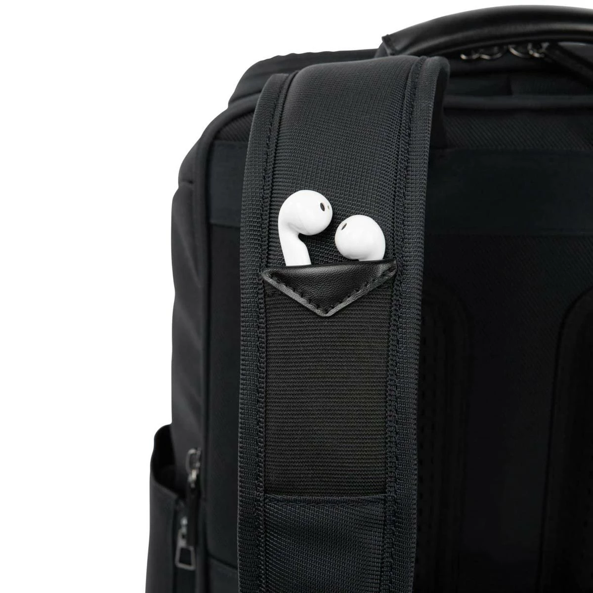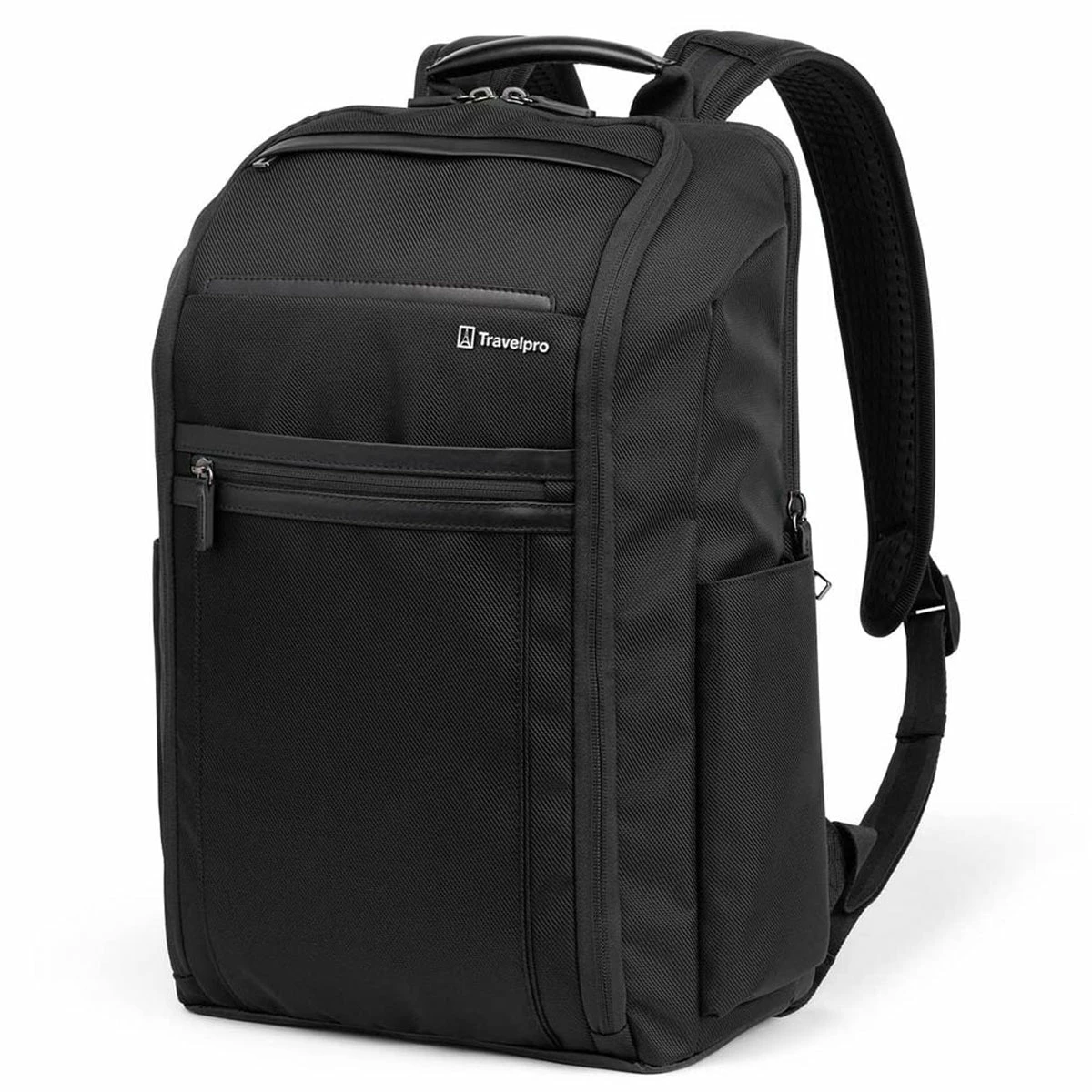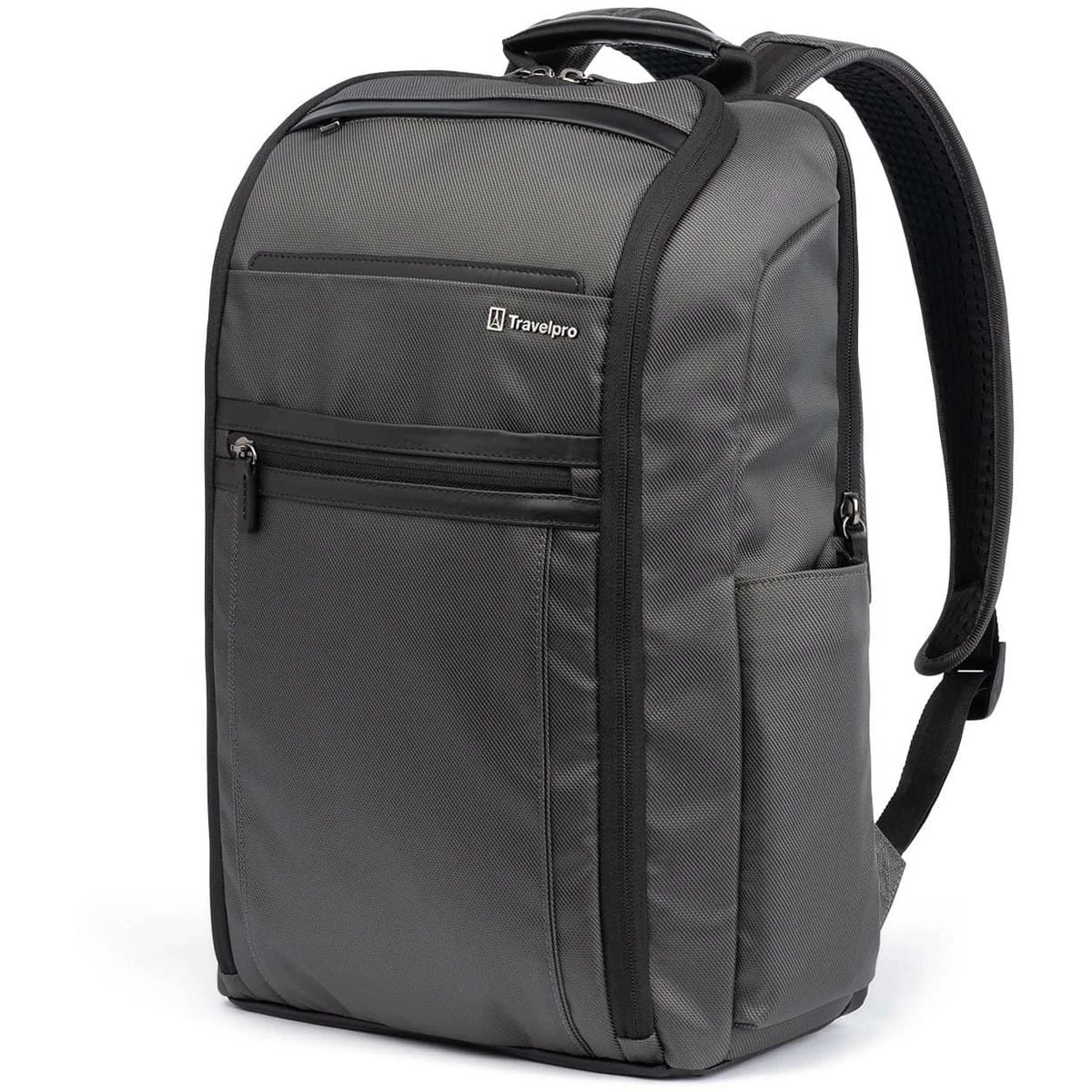 - Crafted with high-quality, stain-resistant nylon fabric and leather accents, this Slim Backpack makes ultimate use of its pared down profile with separate padded tablet and laptop sleeves plus loads of pockets inside and out. Special features include a tricot-lined, exterior top-zip sunglass pocket and Travelpro® QuickSlip™ front pocket with magnetic closure, perfect for cellphone storage on the run. A Travelpro® ID TheftBlock™ pocket keeps credit cards and passports protected against loss and identity theft, and exterior, lie-flat side pockets expand to hold water bottles or an umbrella.